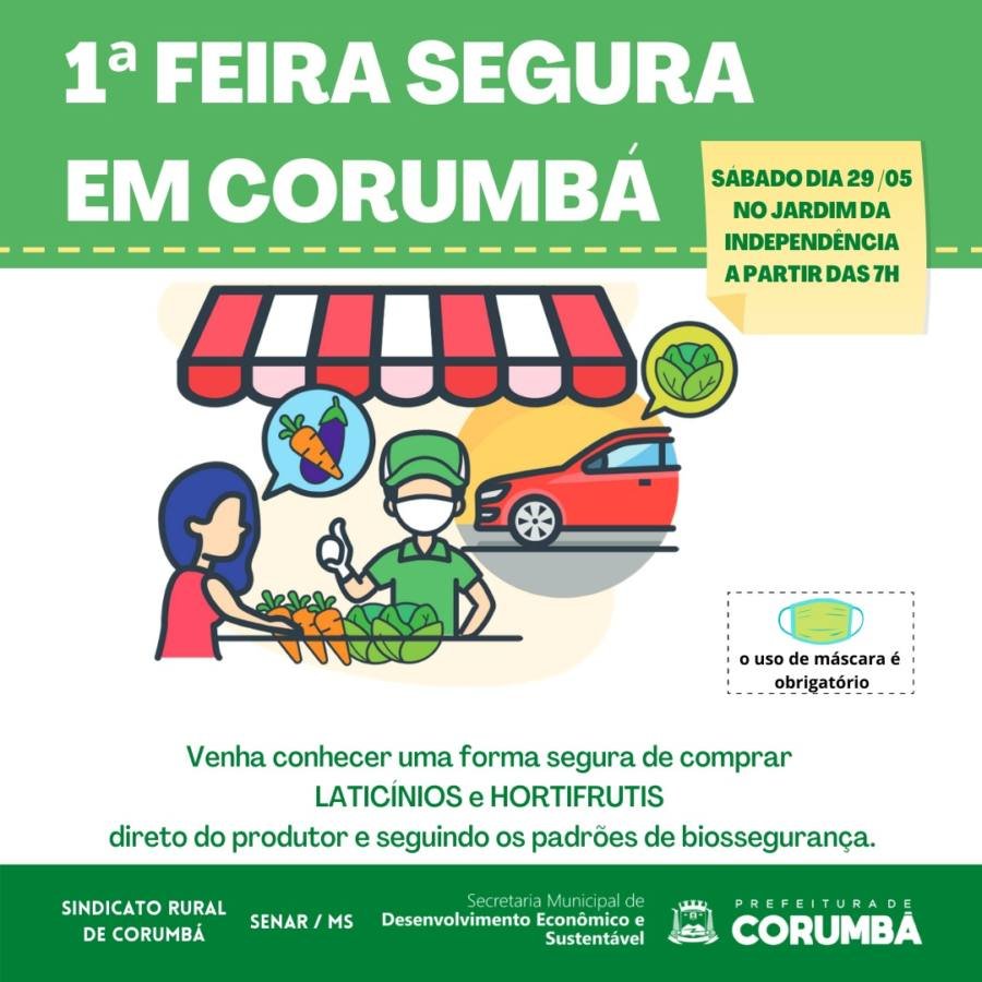 maio 26, 202111:39 amAcontece neste sábado, 29 de maio, no Jardim da Independência, a ”1ª Feira Segura em Corumbá”. A iniciativa é da Confederação Nacional da Agricultura e Pecuária (CNA)/Senar-MS, em parceria com o Sindicato Rural de Corumbá e Prefeitura de Corumbá, por meio da Secretaria Municipal de Desenvolvimento Econômico e Sustentável.