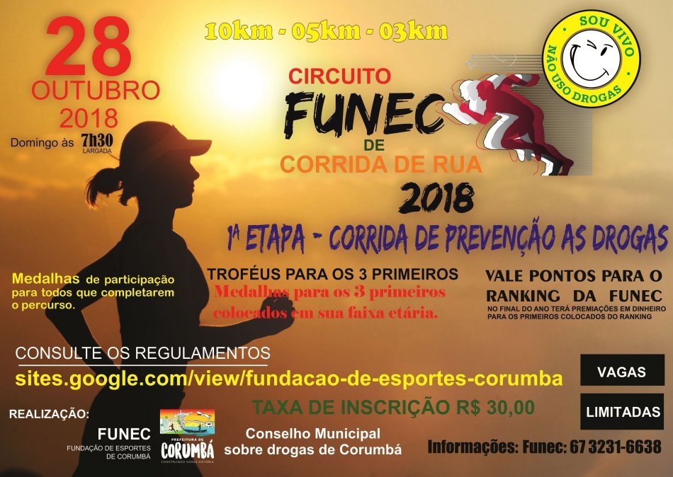 setembro 4, 201810:01 amIntitulada Corrida de Prevenção às Drogas, a primeira etapa do Circuito FUNEC (Fundação de Esportes de Corumbá) de Corrida de Rua acontece no dia 28 de outubro e terá o apoio do Conselho Municipal sobre Drogas de Corumbá. A largada acontece às 7h30 na praça Generoso Ponce, mesmo local da chegada. Os vencedores de cada categoria receberão troféus e medalhas.