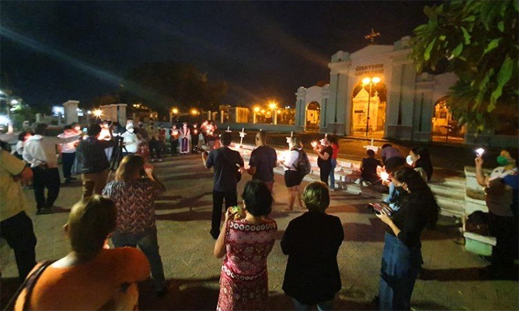 Os participantes se reuniram em frente ao cemitério Santa Cruz, no começo da noite de segunda-feira (21), seguindo as medidas de biossegurança, e partilharam momentos de oração, preces e união para lembrar das pessoas que perderam a batalha para a doença.