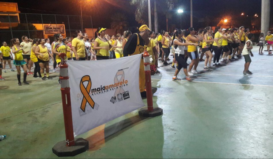 As alunas do Projeto Corumbá em Movimento da Prefeitura de Corumbá foram vestidas a caráter para a aula de ginástica e dança, todas com roupas amarelas, cor oficial do Movimento Maio Amarelo, cujo objetivo é chamar atenção para os índices de acidentes no trânsito.