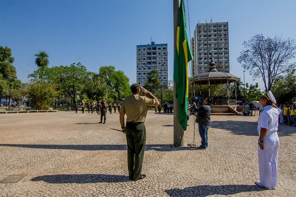 Estudantes das escolas Cyríaco Félix de Toledo (Municipal); João Leite de Barros e Júlia Ginçalves Passarinho (ambas estaduais), com a Banda Manoel Florêncio, participam da solenidade de hasteamento na quinta-feira, dia 06. Representantes da Fundação de Esportes de Corumbá (Funec) e da Fundação da Cultura e do Patrimônio Histórico de Corumbá acompanham o arriar da bandeira brasileira.