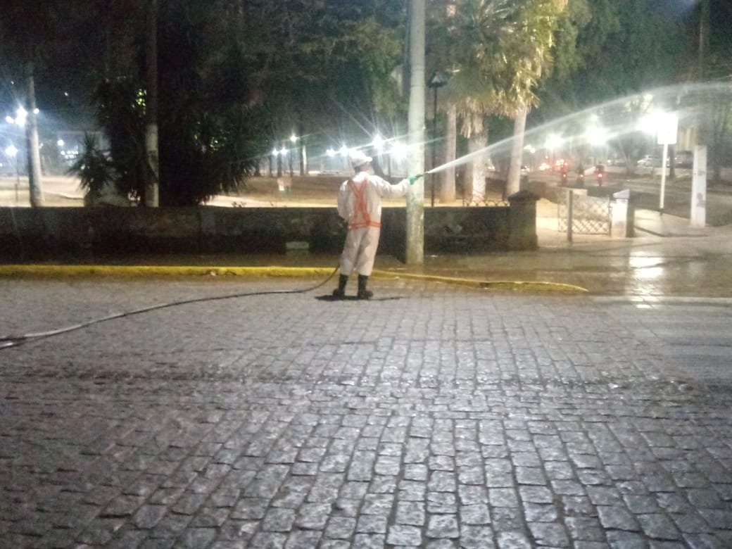 A desinfecção das áreas de uso comum é feita com água e hipoclorito de sódio e começa sempre após às 18h30. Às segunda, quartas e sextas-feiras o trabalho é feito na rua Cuiabá, em frente à Caixa Econômica Federa, e em trechos da Antônio Maria, Frei Mariano, 15 de Novembro, Delamare e 13 de Junho.