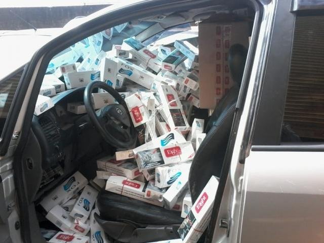 Por volta de 5h da madrugada de hoje, os policiais apreenderam uma Zafira prata com placa de Goiânia (GO) com 2.000 pacotes de cigarro fabricado no Paraguai e de venda proibida no Brasil.