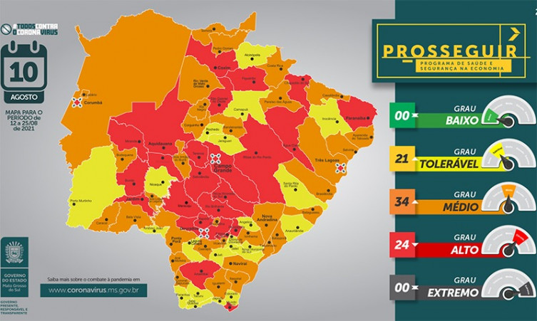 No grau alto, categorizado pelo mapeamento vermelho e que recomenda apenas atividades essenciais e não essenciais de baixo risco estão: Água Clara, Amambai, Anastácio, Aquidauana, Bonito, Campo Grande, Chapadão do Sul, Coxim, Deodápolis, Dourados, Fátima do Sul, Figueirão, Itaporã, Jardim, Maracaju, Miranda, Mundo Novo, Nova Alvorada do Sul, Paranaíba, Ribas do Rio Pardo, Rio Brilhante, São Gabriel do Oeste, Sidrolândia e Terenos.