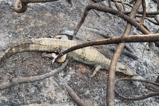 “Apesar dos bombeiros terem apagado os focos, o solo ainda está muito quente aqui. Encontramos um jacaré, que, provavelmente, é uma fêmea. Ela foi encontrada a cerca de três metros do ninho, que estava com vários ovos. Certamente, não quis deixar o ninho na hora em que as chamas se aproximaram”, relatou.