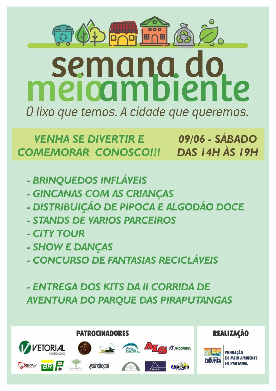 junho 8, 201810:22 amA Prefeitura de Corumbá, por meio da Fundação do Meio Ambiente do Pantanal, com o apoio do diversos parceiros, promove no sábado, 09 de junho, a Feira Ambiental, das 14h às 19 horas, no Jardim da Independência.
