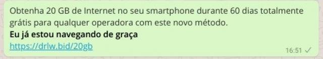 Golpe de WhatsApp oferece 20GB de internet e instala vírus no celular
