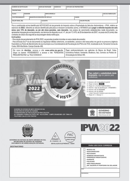 A Notificação do IPVA 2022, recebida pelo contribuinte pelos Correios, tem um único modelo. Na parte da frente há uma janela com informações, instruções para pagamentos e verificação de autenticidade do documento.