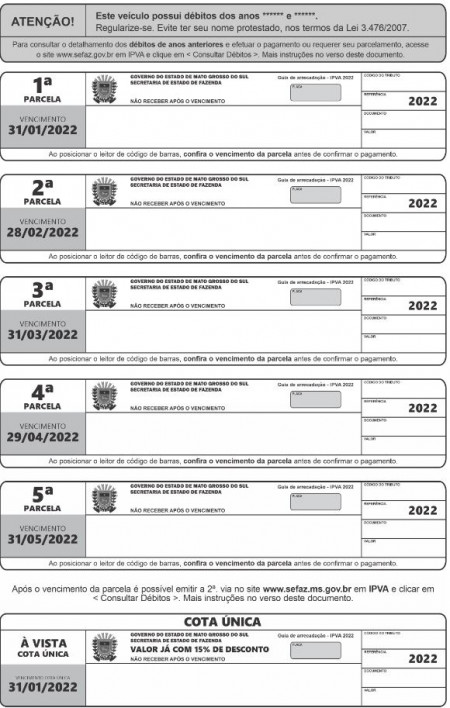 1ª parcela: espaço destinado ao pagamento da primeira parcela do imposto, quando o contribuinte fez a opção pelo pagamento parcelado em até 5 vezes. O canhoto é composto dos campos: placa do veículo, data de vencimento da parcela (neste caso, 31/01/2022), código do tributo que está sendo recolhido (nesse caso, 213), código de barras, ano de referência do imposto (2022), número do documento (número interno de referência da SEFAZ-MS), valor da parcela a ser paga.2ª parcela: campo destinado ao pagamento da segunda parcela do imposto, quando o contribuinte fez a opção pelo pagamento parcelado em 5 vezes. A composição do canhoto é similar ao do canhoto da Primeira Parcela, tendo somente como diferencial a data de vencimento da mesma, que nesse caso é 28/02/2022.
