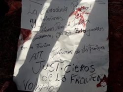 “Aviso geral: La cidadania pidió y volvimos. Estamos para la justiça de la cidadania, ya no robo y assaltos em la fronteira. Att. Justiceiros de la Fronteira. Volvimos… No mas robos em la fronteira”, era a mensagem escrita em espanhol no cartaz.