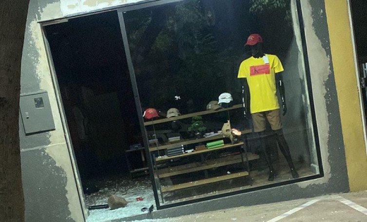 Loja tem porta de vidro quebrada e dois são presos com roupas e bonés furtados