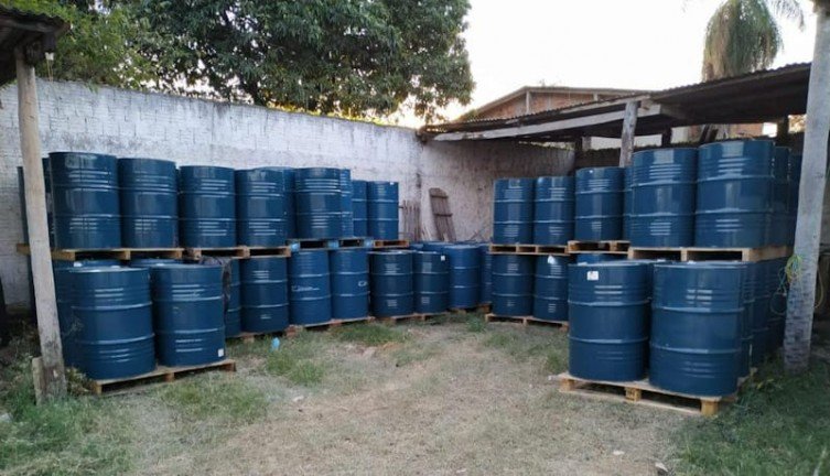 Os agentes federais receberam denúncia anônima, foram até o local e encontraram barris de 200 litros cada, armazenados sobre paletes, prontos para serem carregados.