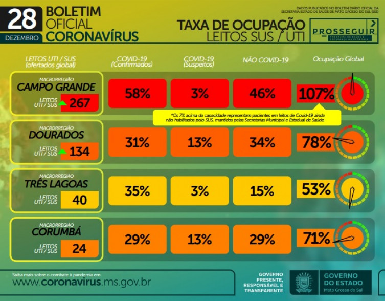 Com o avanço nas internações, a disponibilidade do leito para tratamento segue comprometida. Na macrorregião de Campo Grande, a ocupação global de leitos UTI SUS atinge 107%, nesse caso, o excedente representa pacientes em leitos Covid-19 ainda não habilitados pelo SUS, mantidos pelas secretarias municipais e estadual de saúde. Na macrorregião de Dourados, a ocupação global é de 78%, em Três Lagoas, de 53% e em Corumbá, de 71%.