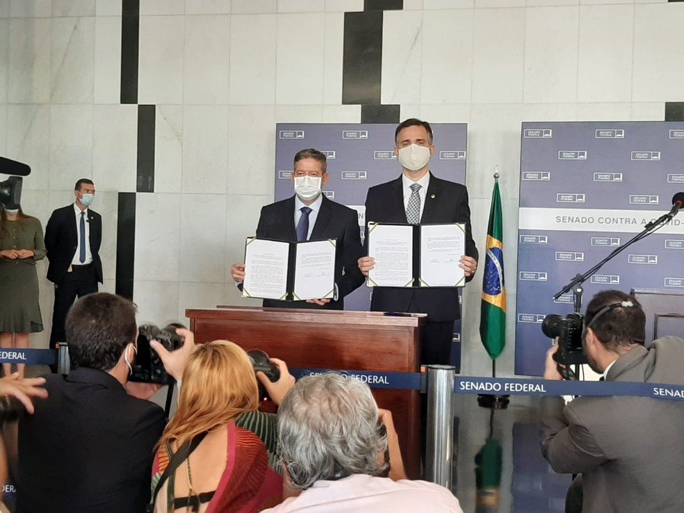 fevereiro 3, 202110:46 amOs novos presidentes do Senado e da Câmara, Rodrigo Pacheco (DEM-MG) e Arthur Lira (PP-AL), apresentaram nesta quarta-feira (3) medidas que consideram prioritárias para o país e assinaram um documento em que reforçam a intenção de dar agilidade à vacinação contra a Covid-19.