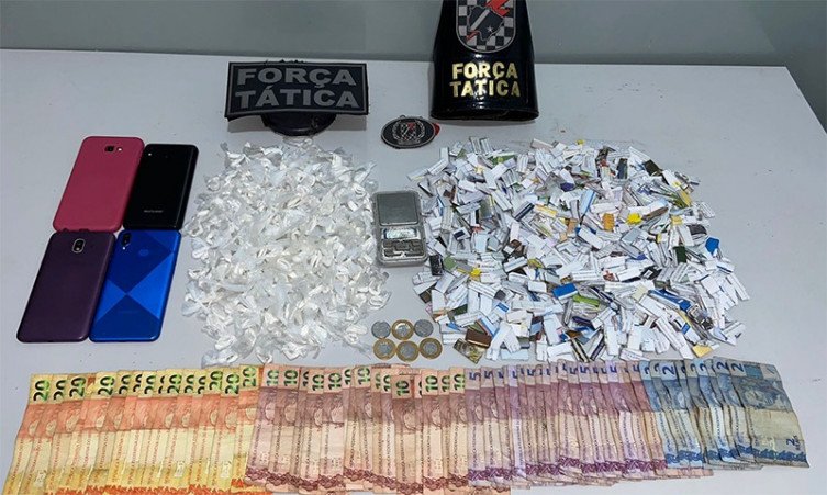 Durante a revista, a PM apreendeu 565 reais e quatro papelotes de pasta base. Indivíduo de 21 anos se apresentou como dono da casa, que tem apenas dois cômodos, um quarto e um banheiro desativado, possuindo apenas um guarda roupas e uma cama. Na entrada da residência havia um celular, de cor preta, o mesmo que foi furtado do estabelecimento comercial.