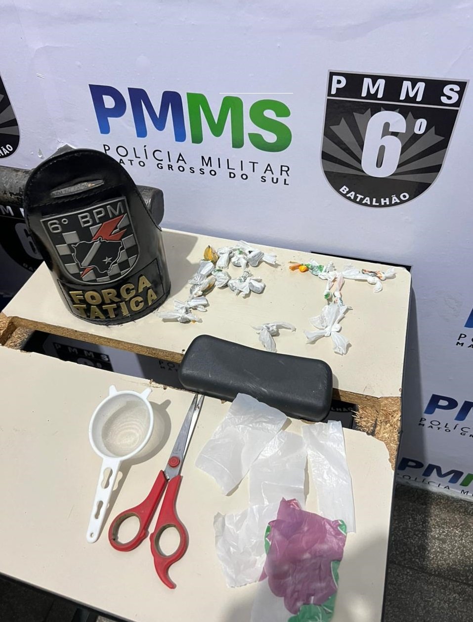 Em ato contínuo, os policiais adentraram a residência e localizaram o suspeito. Em buscas no interior do imóvel, a Força Tática encontrou mais 13 trouxinhas de maconha escondidas sob um guarda-roupas. Sobre o mesmo móvel, também foi encontrada uma bolsa contendo diversos utensílios utilizados para o preparo e fracionamento das drogas, como peneira, tesoura e plásticos cortados. Os indivíduos foram encaminhados à Primeira Delegacia de Polícia Civil de Corumbá.