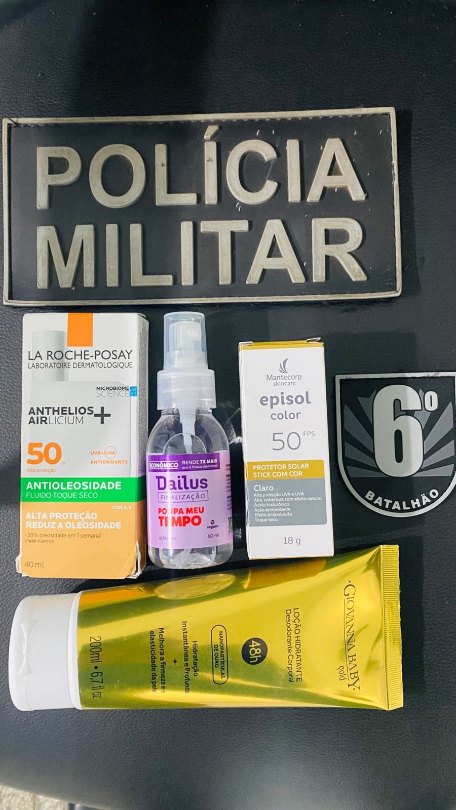 No local, os produtos subtraídos foram apresentados, incluindo itens de higiene e cosméticos, que foram apreendidos e encaminhados à Delegacia de Polícia Civil para as providências legais cabíveis.