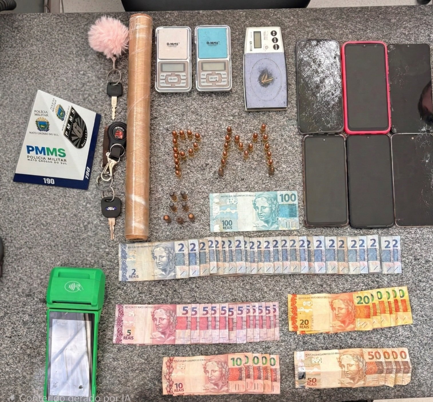 Durante a busca pessoal, foram localizadas 30 munições calibre 9mm em posse de um dos abordados, que não apresentou qualquer autorização legal para portar o material. Questionado, ele afirmou que as munições pertenciam a um familiar. Em continuidade às diligências, as equipes realizaram buscas, com apoio dos cães de detecção K9 Pacu e K9 Zeck, ocasião em que foram encontradas outras munições de calibres .40 e .357, além de balanças de precisão, aparelhos celulares e dinheiro em cédulas fracionadas. Diante dos fatos, os envolvidos foram encaminhados à Delegacia de Polícia Civil para as providências legais cabíveis.