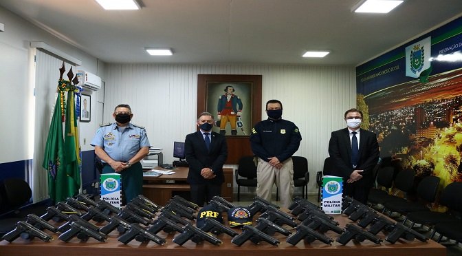 A integração entre as forças de segurança tem gerado parcerias importantes no combate à criminalidade em Mato Grosso do Sul. O resultado disto aconteceu nesta terça-feira (19.5), em que Polícia Rodoviária Federal (PRF) doou à Secretaria de Estado de Justiça e Segurança Pública (Sejusp), para uso da Polícia Militar, mil pistolas semiautomáticas PT 100, da marca Taurus – calibre .40 mm.