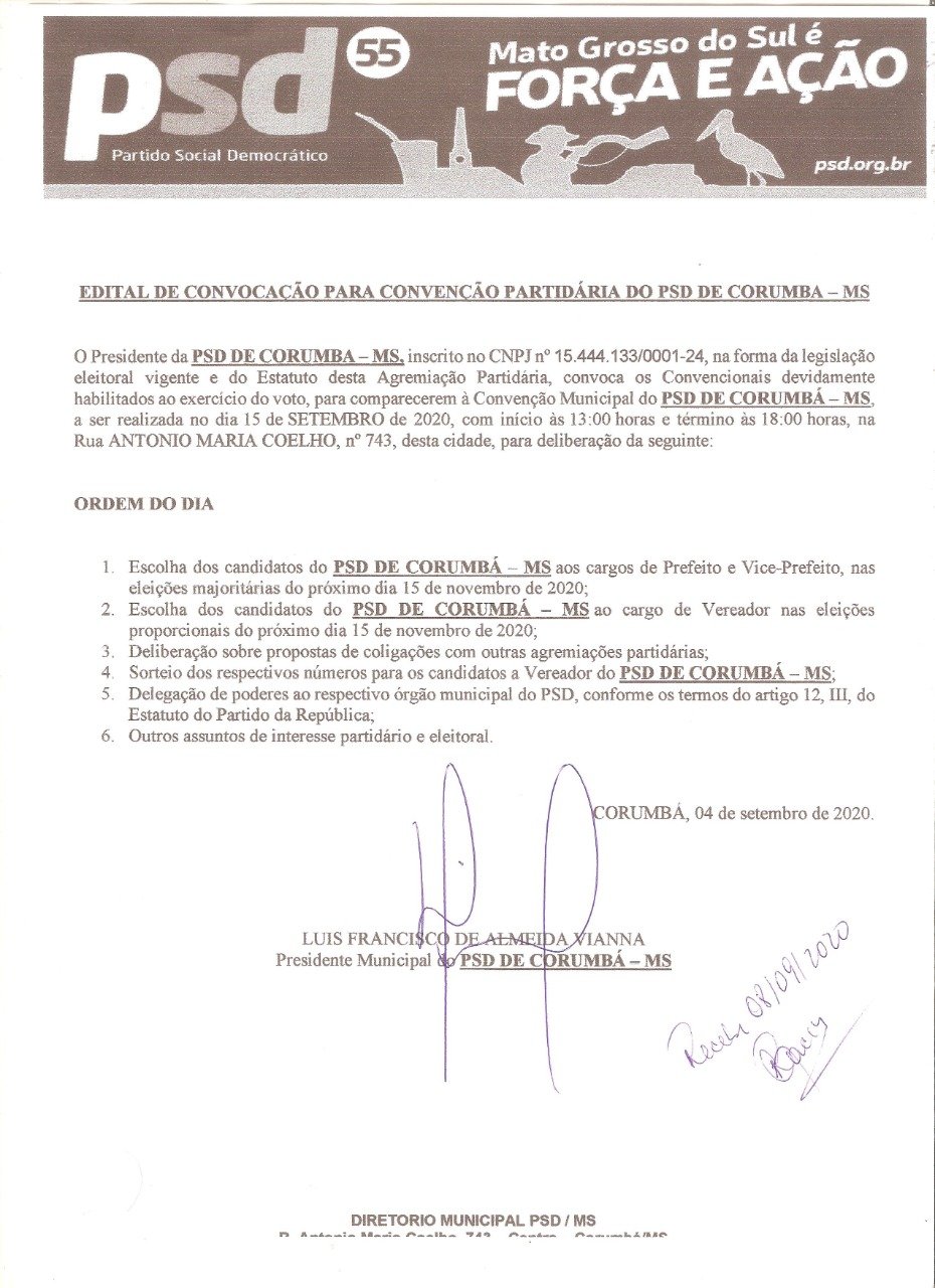 O Partido Social Democrático (PSD) marcou a data de sua convenção para definir os rumos do partido nas eleições municipais deste ano em Corumbá.