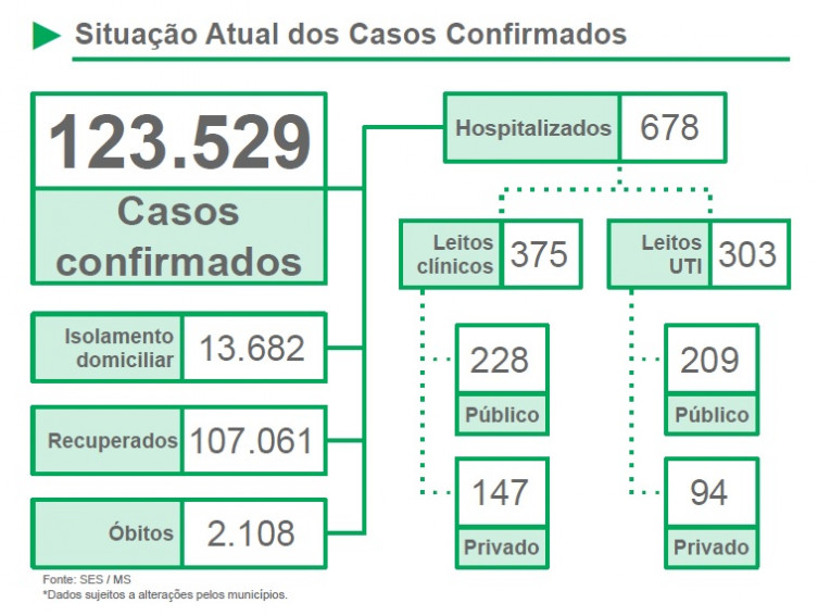 Mato Grosso do Sul possui 14.360 casos ativos da doença, sendo 13.682 em isolamento domiciliar e 678 pacientes internados em leitos clínicos (375) e de UTI (303). A taxa de ocupação de leitos na macrorregião de Campo Grande está em 111%, Dourados 84%, Três Lagoas 58% e Corumbá 55%.