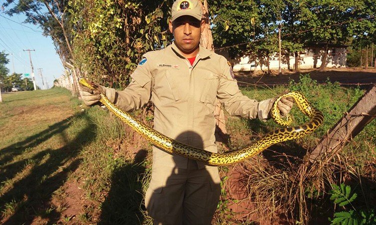 maio 11, 201810:31 amUma sucuri, de aproximadamente 1,5 metro, foi capturada por guarnição do 3º Grupamento de Bombeiros Militar de Corumbá por volta das 16h de quinta-feira, 10 de maio. A serpente estava no meio de uma das pistas da avenida Rio Branco, que liga Corumbá ao município vizinho, Ladário.
