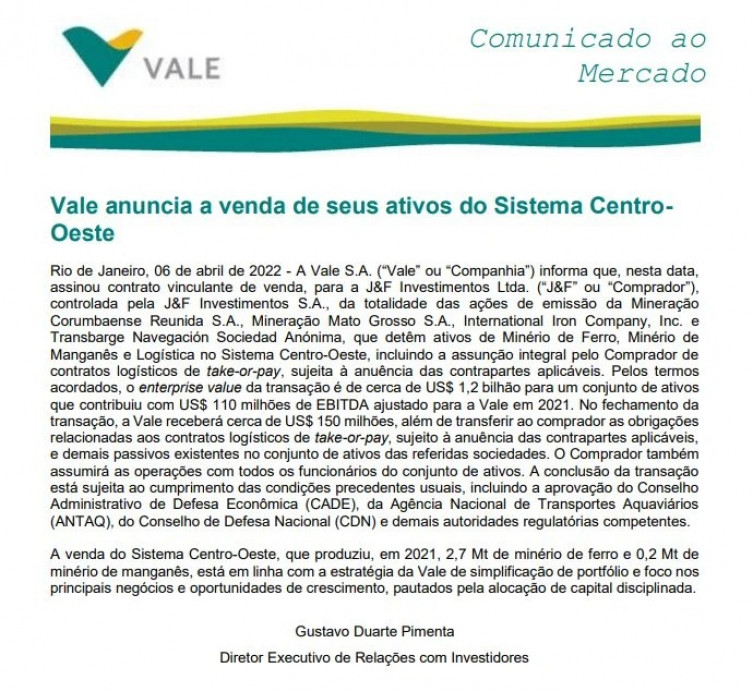 A Vale confirmou que assinou contrato vinculante de venda para a J&F Mineração Ltda., controlada pela J&F Investimentos S.A., da totalidade das ações de emissão da Mineração Corumbaense Reunida S.A., Mineração Mato Grosso S.A., International Iron Company, Inc. e Transbarge Navegación Sociedad Anónima, que detêm ativos de Minério de Ferro, Minério de Manganês e Logística no Sistema Centro-Oeste (em Corumbá), incluindo a assunção integral pelo Comprador de contratos logísticos de take-or-pay, sujeita à anuência das contrapartes aplicáveis.